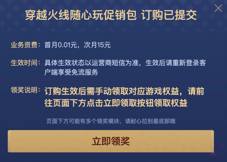 办穿越火线业务,只扣0.01赠送2话费,记得退订,否则次月15块。
