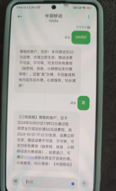 【订购提醒】尊敬的客户,您于2024年10月01日17时12分通过短信营业厅成功办理50元话费包,自2024-10-01 17:12:31生效,话费立即生效,赠送话费不可退、不可转,可支付所有费用(除梦网、信息、小额移动支付费用等)。如需退订,可通过10086或移动营业厅咨询办理。