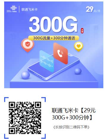 超值首发!联通飞米卡:29元享300G流量+300分钟!首月0元体验!