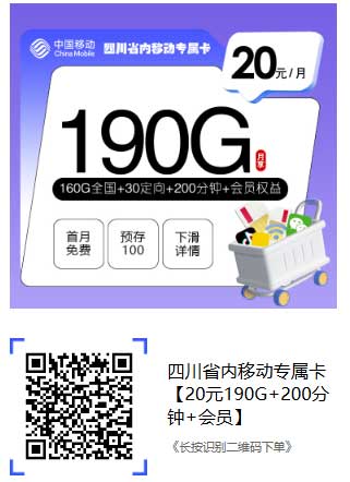 🔥四川青年专属|移动超值流量卡:仅需20元/月享190G+200分钟通话+会员权益!首月免租,下单预存即送豪礼!