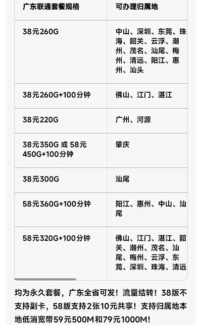 肇庆联通38元350G或58元450G+100分钟 可转